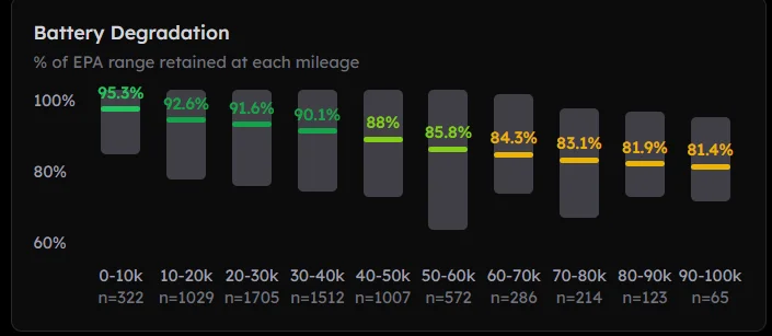 Samochód z przebiegiem 0 – 10 000 mil, czyli 0 – ok. 16 000 km, zachowuje 95,3% pierwotnej pojemności akumulatora. Po przejechaniu ok. 10 000 – 20 000 mil, czyli ok. 16 000 – 32 000 km, bateria ma pojemność 92,6%. Gdy pokona 90 000 – 100 000 mil, czyli ok. 144 000 – 160 000 km, pojemność spada do 81,4%, a to nadal świetny wynik.