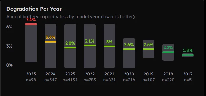 Najniższa degradacja na poziomie 1,8%, 2,2% oraz 2,6% dotyczy samochodów z lat 2017-2019. Oznacza to, że baterie w starszych modelach zużywają się zdecydowanie wolniej niż w nowych (1,8% 2017 r. vs 7,4% 2025 r.). Wynika to głównie z faktu, iż wcześniej bardzo często w autach elektrycznych montowano ogniwa niklowo-kobaltowo-aluminiowe o stabilniejszych parametrach. W nowszych modelach najczęściej wykorzystywane są ogniwa litowo-żelazowo-fosforanowe. Charakteryzują się wyższą gęstością energii, a to przekłada się na większą wydajność i zasięg, ale jednocześnie są mniej wytrzymałe.